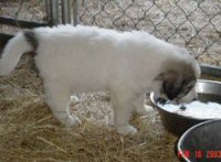 Every litter of LGD pups needs its own bummer lamb. One of the ewes cooperated by giving birth to, then abandoning, this one. The lamb is in the house for his own protection. He seems unable to regulate his body temperature and can't handle the cold, wet weather outside.