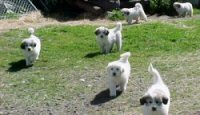 Sage proudly shows off her pups; four females, five males. All but one male are well marked; one male is all white, but his eyes are already shaded with grey. Sage is a working livestock guardian dog here at White Dog Ranch, but she adapts very quickly to living in the house while her puppies are tiny. She and they will go out to the barn when the pups are about four weeks old.